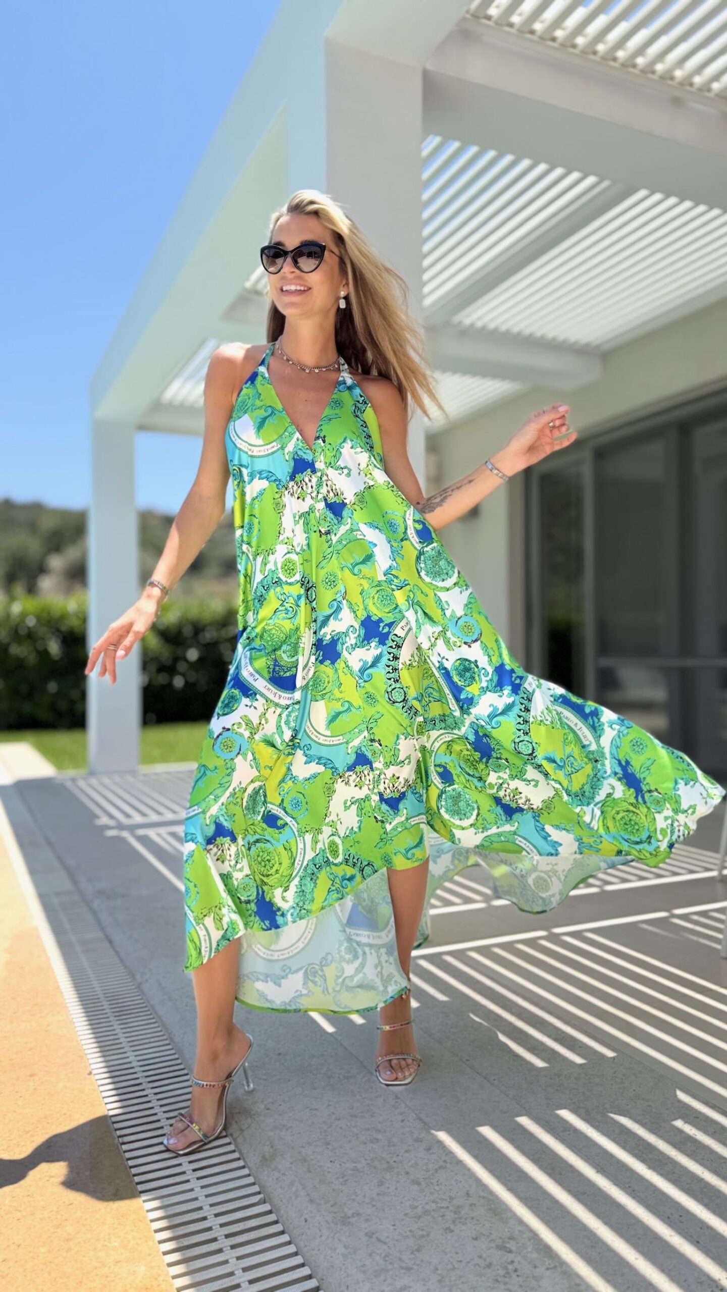 Long gown with a beautiful neckline in the front and back with a shawl/scarf included.