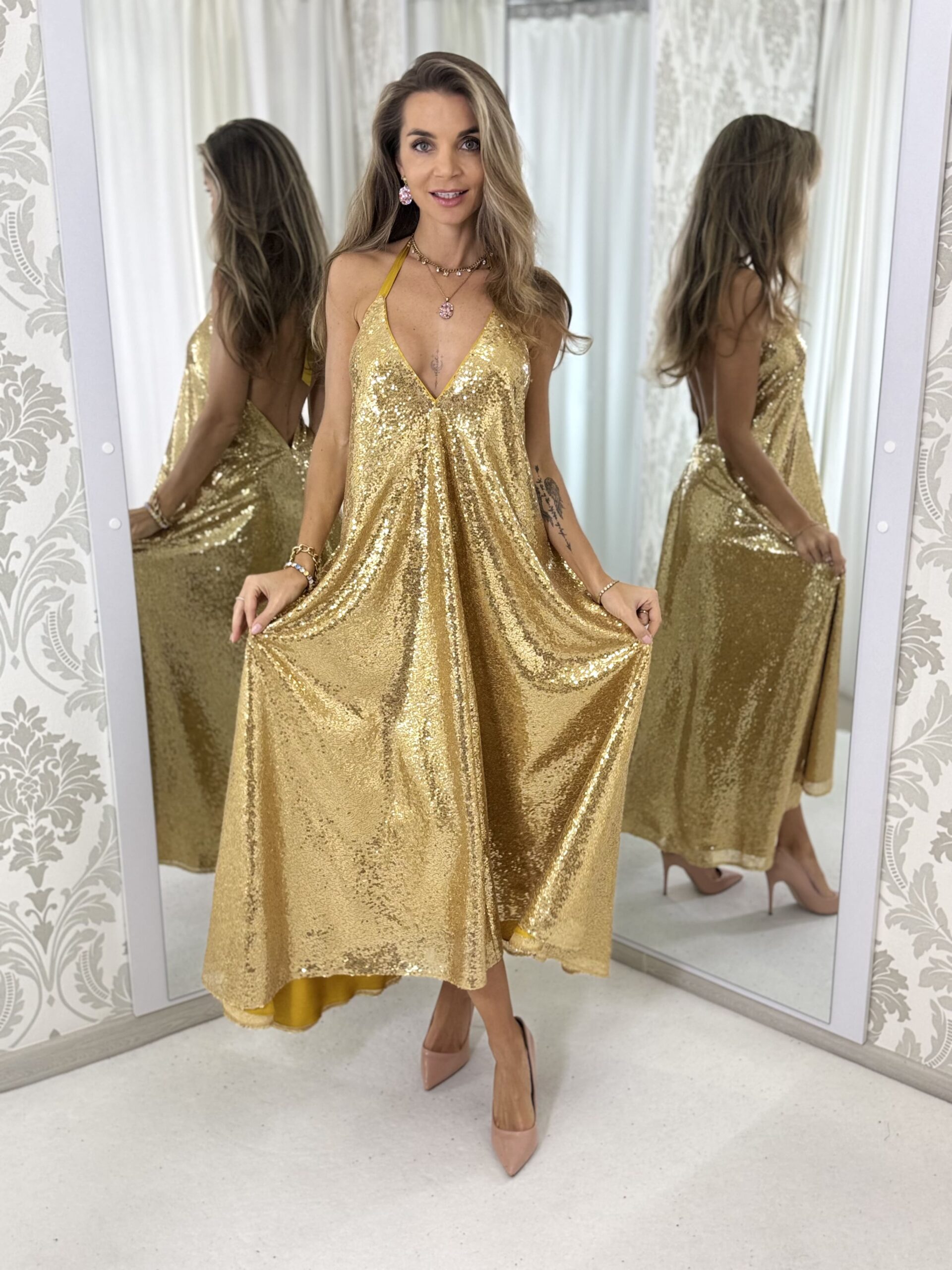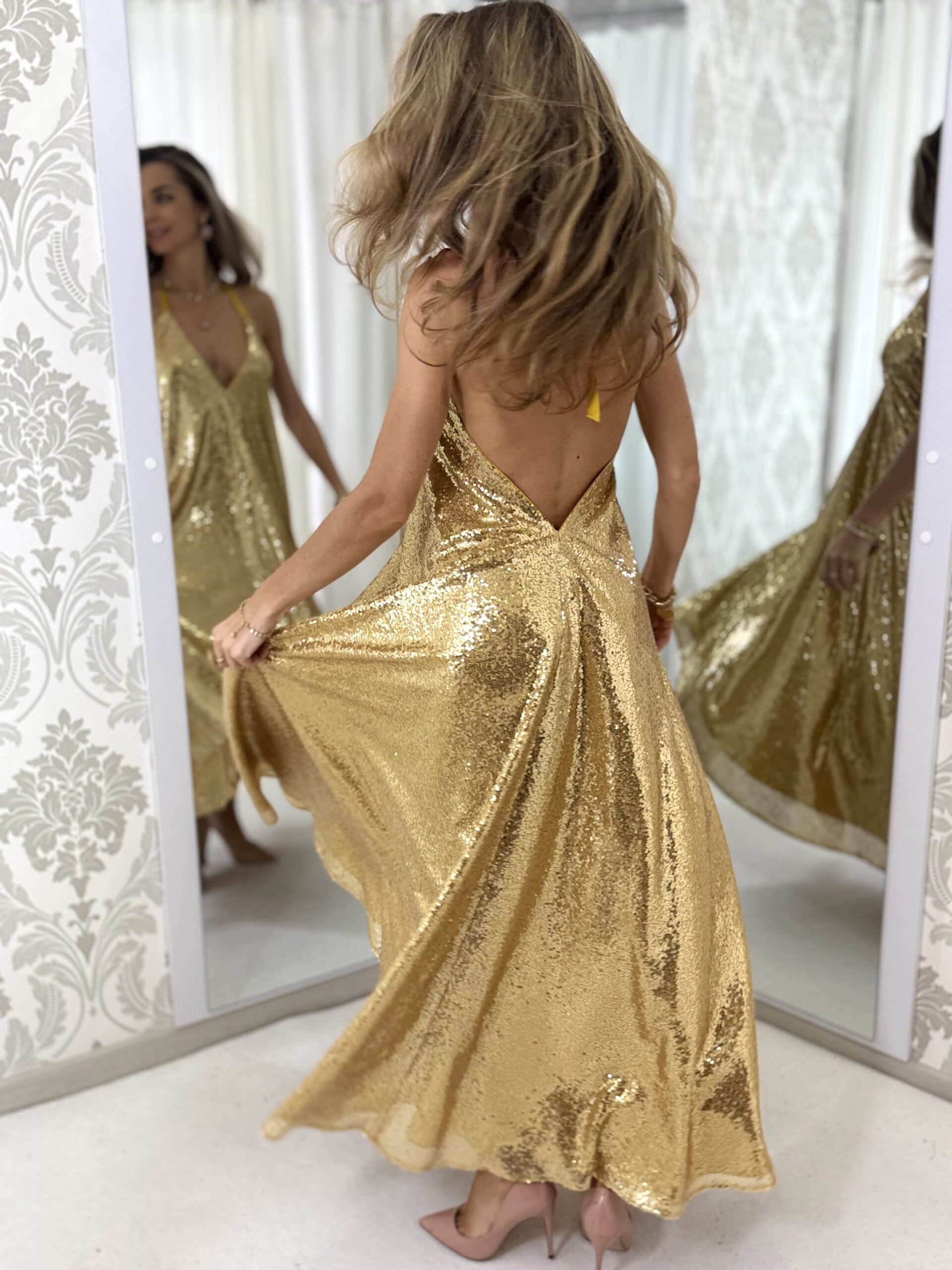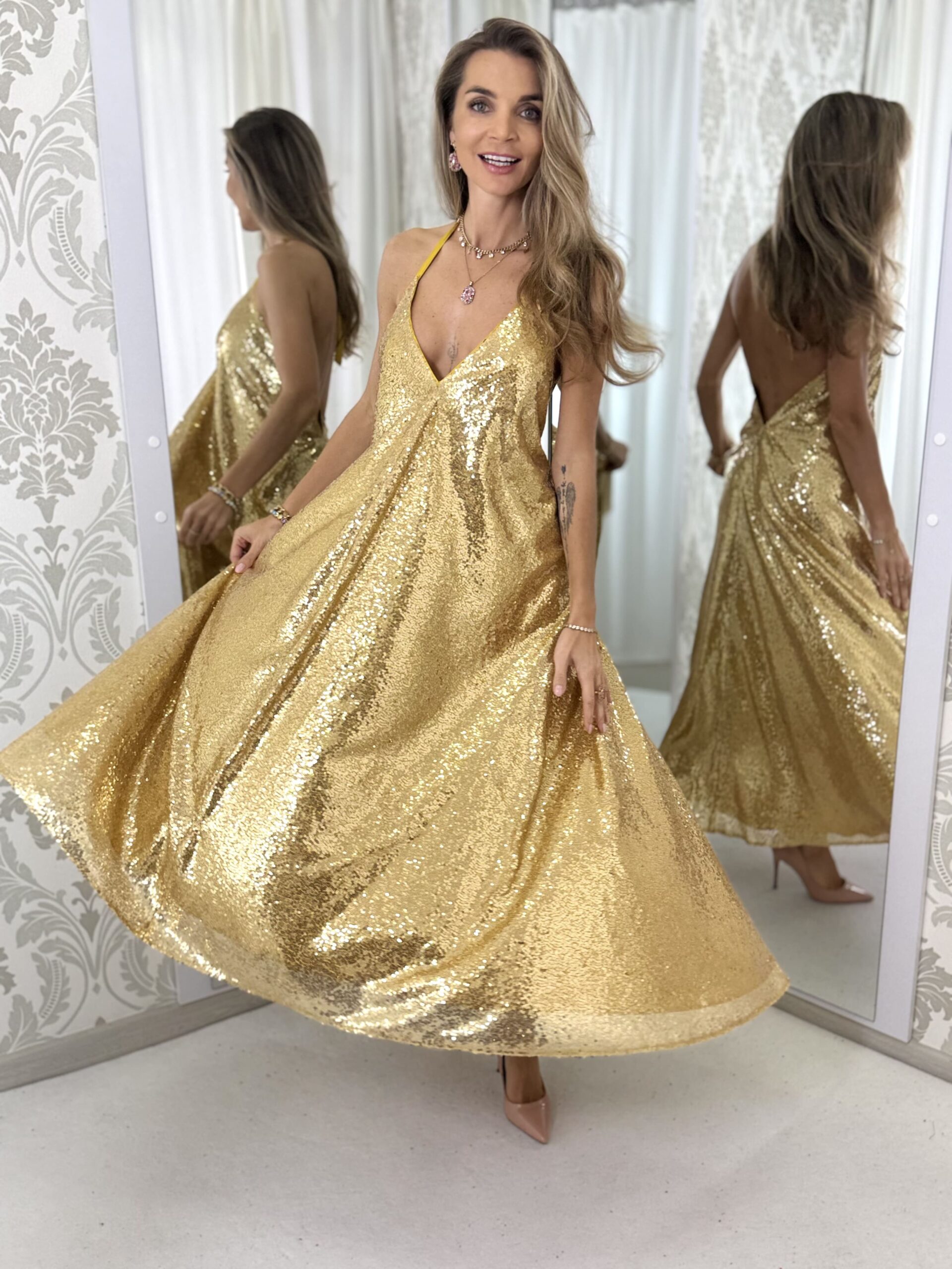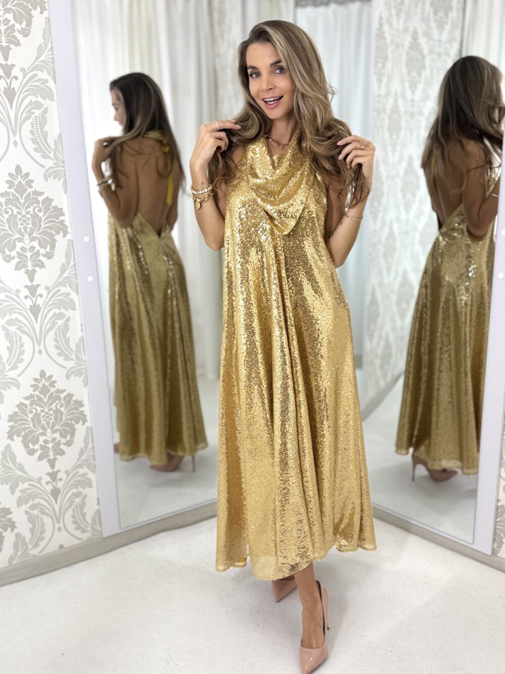 The Bella Glamour long dress is the essence of elegance and feminine charm. Made from high-quality, shimmering sequin fabric, it beautifully reflects the light, creating a dazzling effect with every movement. The deep neckline at the front and back adds a touch of sophistication and allure. It’s the perfect choice for grand occasions, balls, galas, or evening events.
