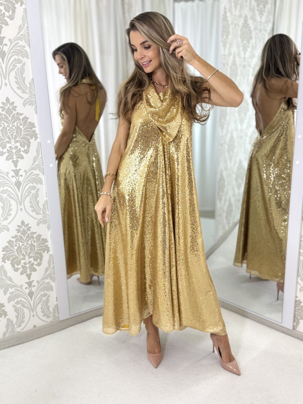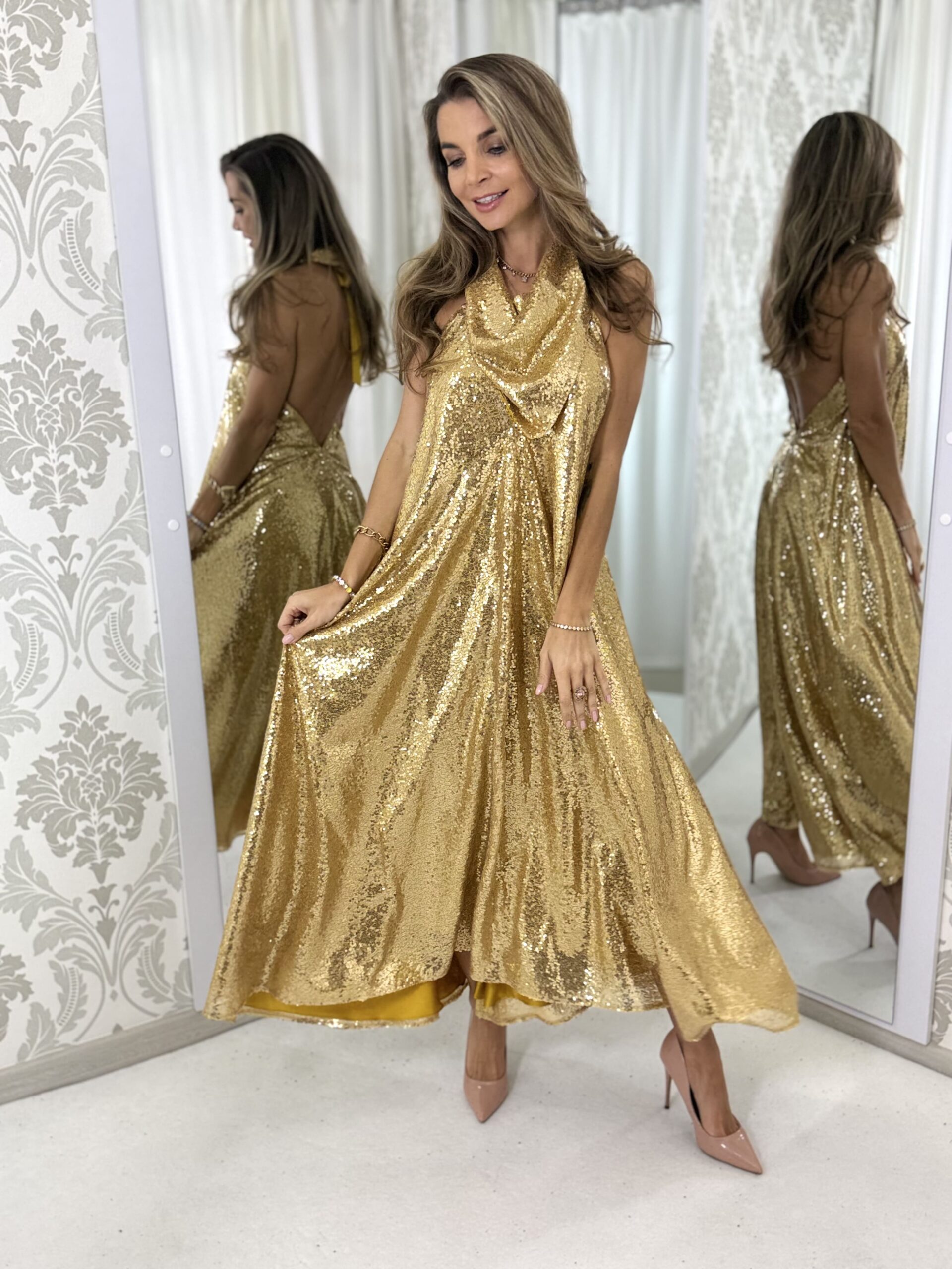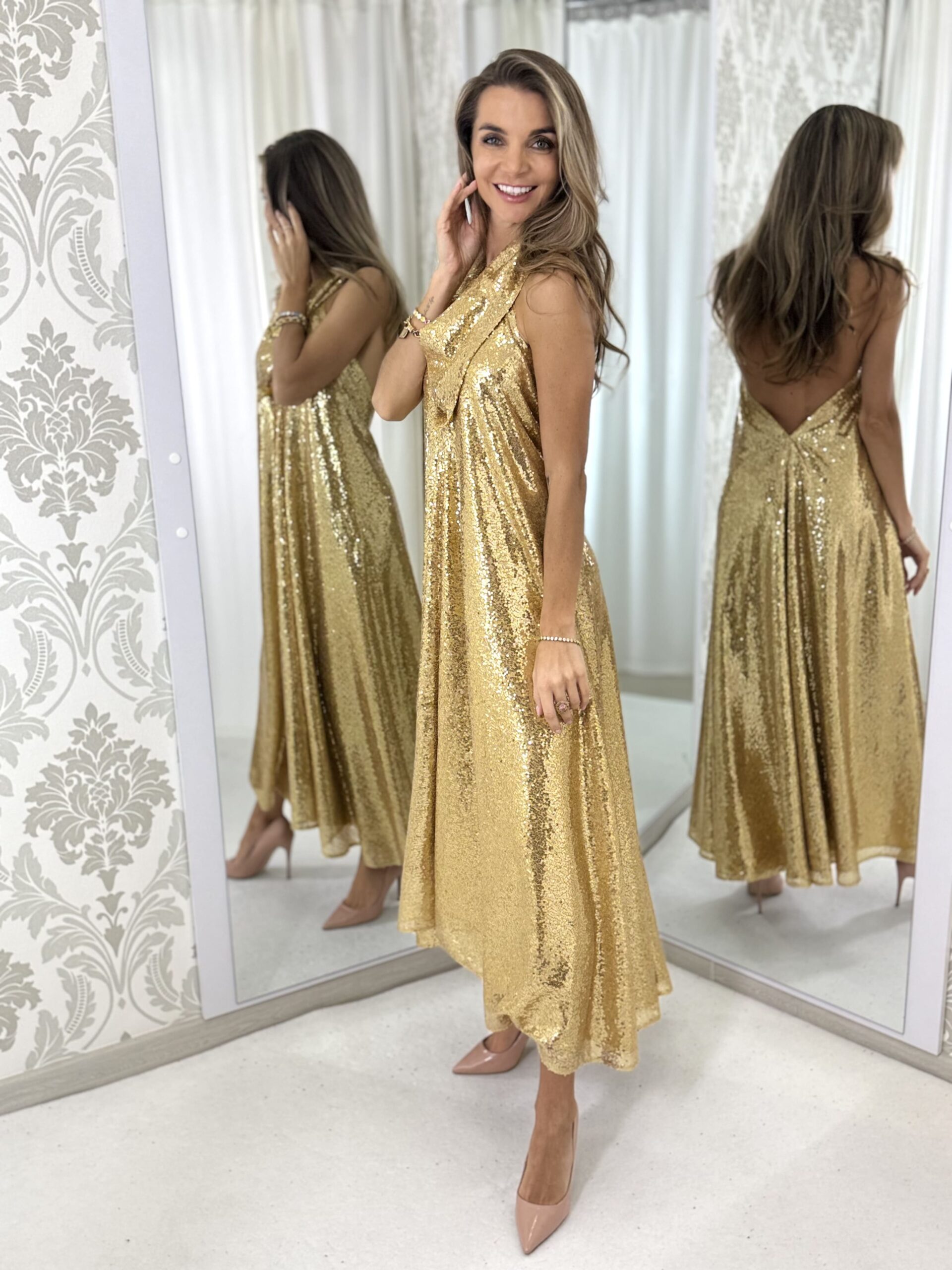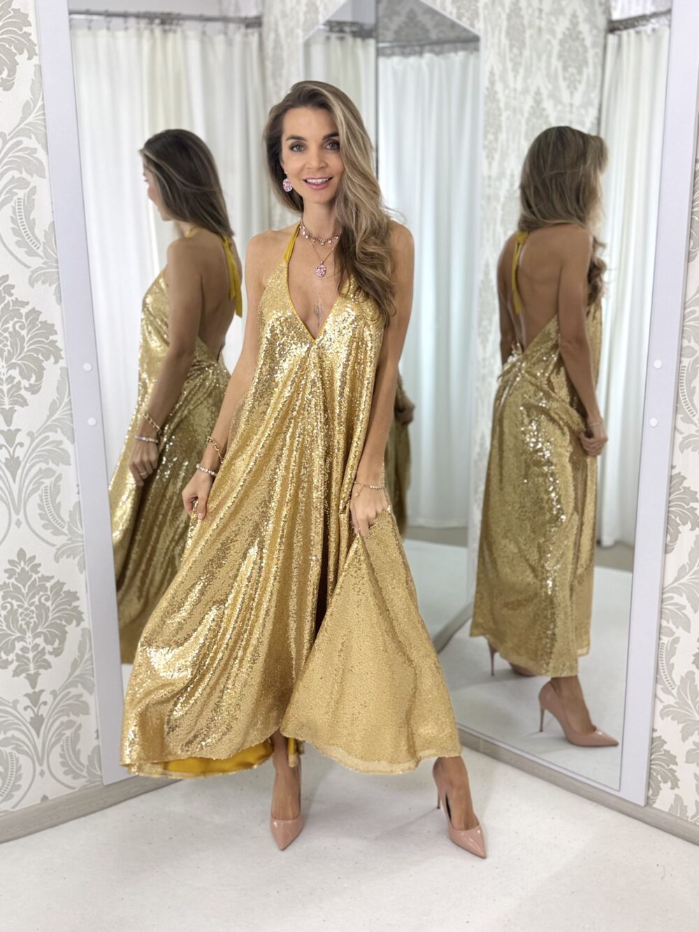 The Bella Glamour long dress is the essence of elegance and feminine charm. Made from high-quality, shimmering sequin fabric, it beautifully reflects the light, creating a dazzling effect with every movement. The deep neckline at the front and back adds a touch of sophistication and allure. It’s the perfect choice for grand occasions, balls, galas, or evening events.