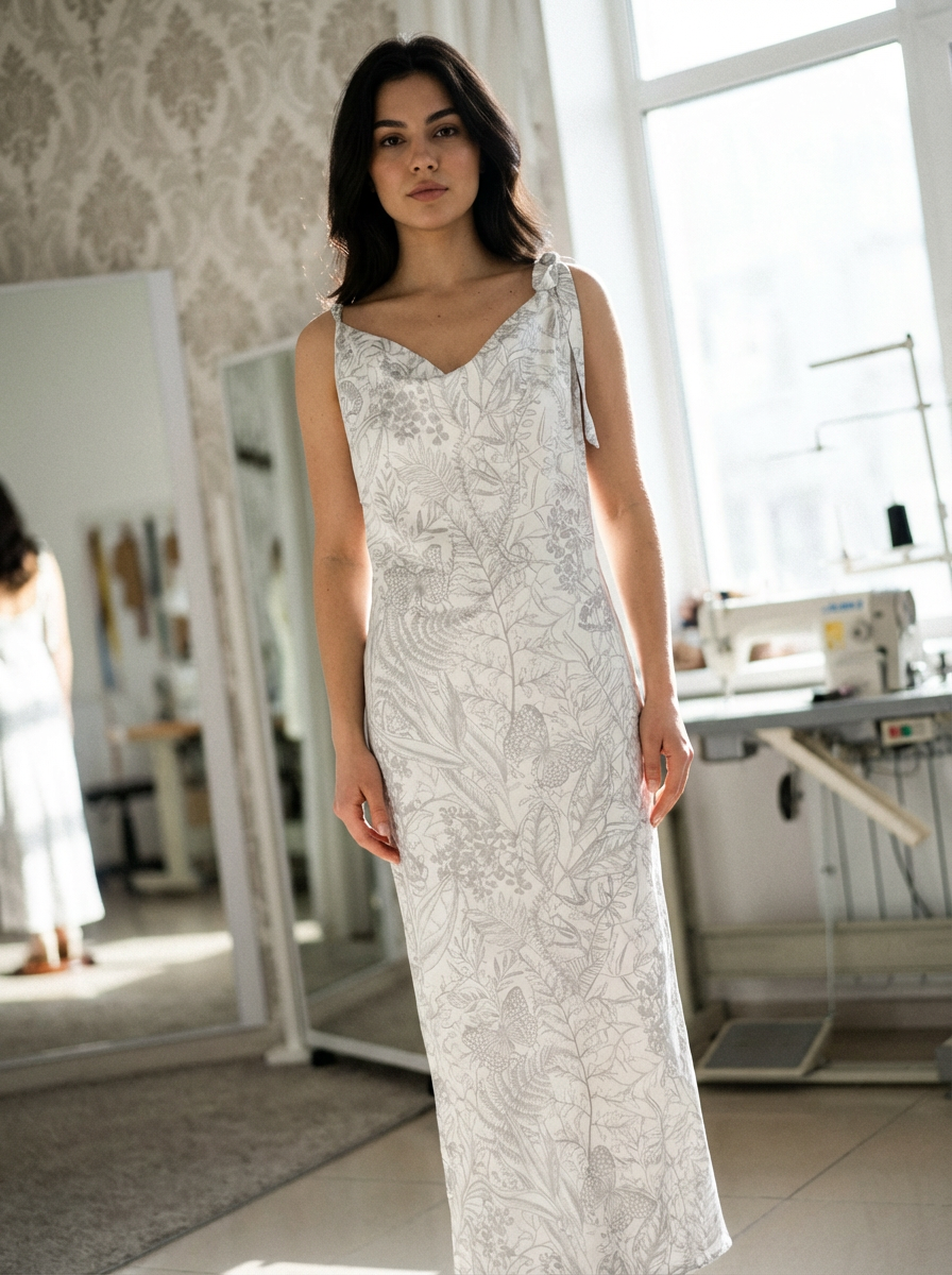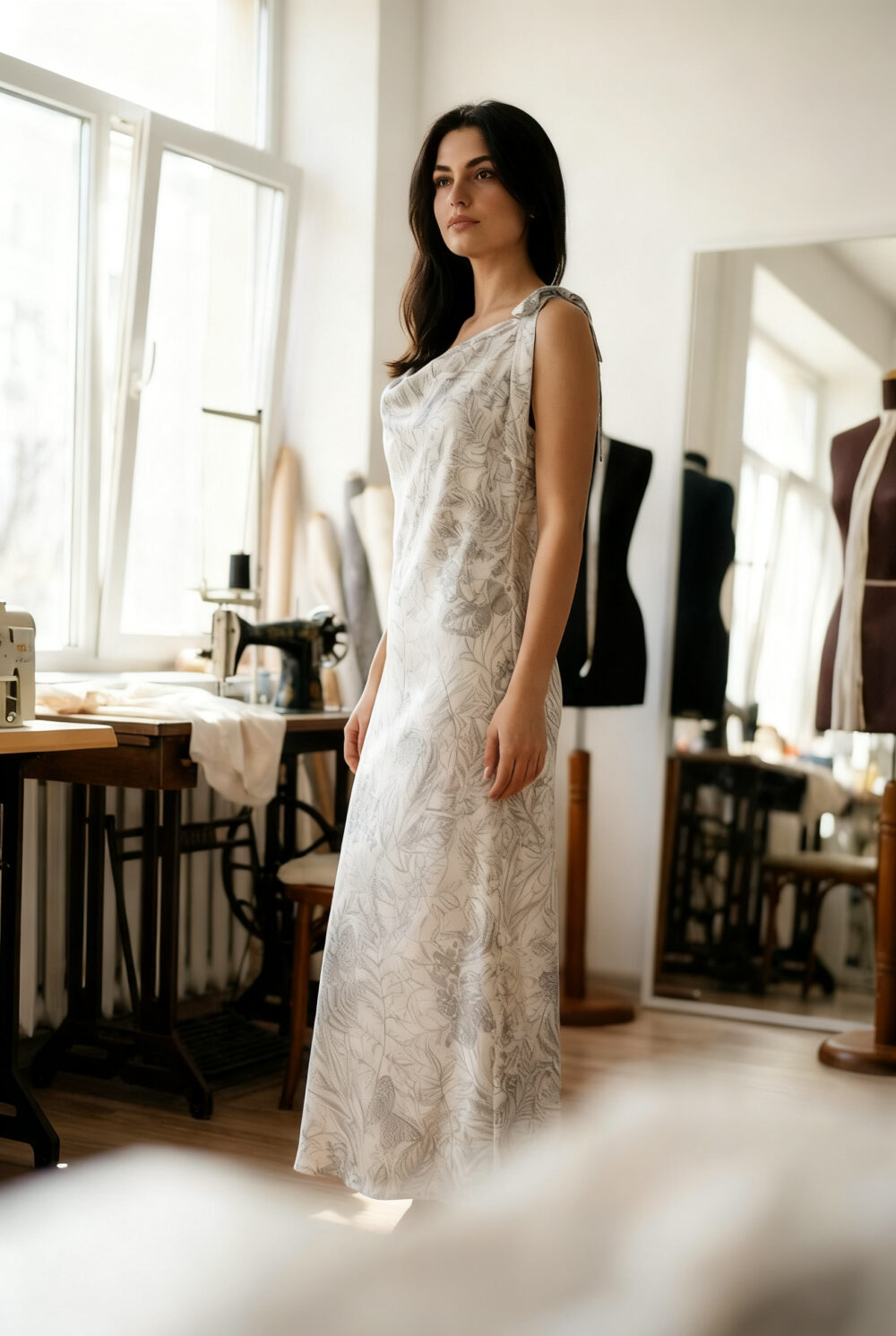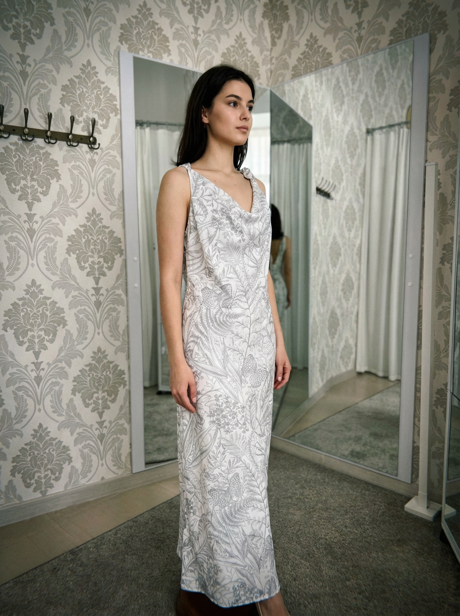 Long dress with flowing neckline (multiway: neckline in front, or in back, and slits on the sides)