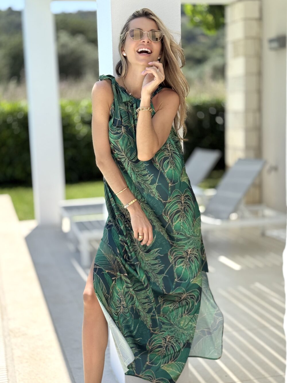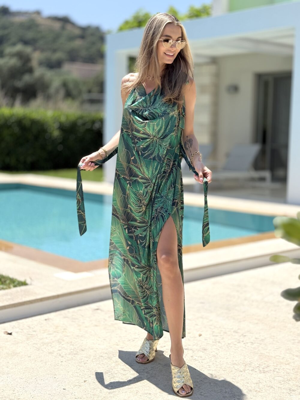 Long dress with flowing neckline (multiway: neckline in front, or in back, and slits on the sides)