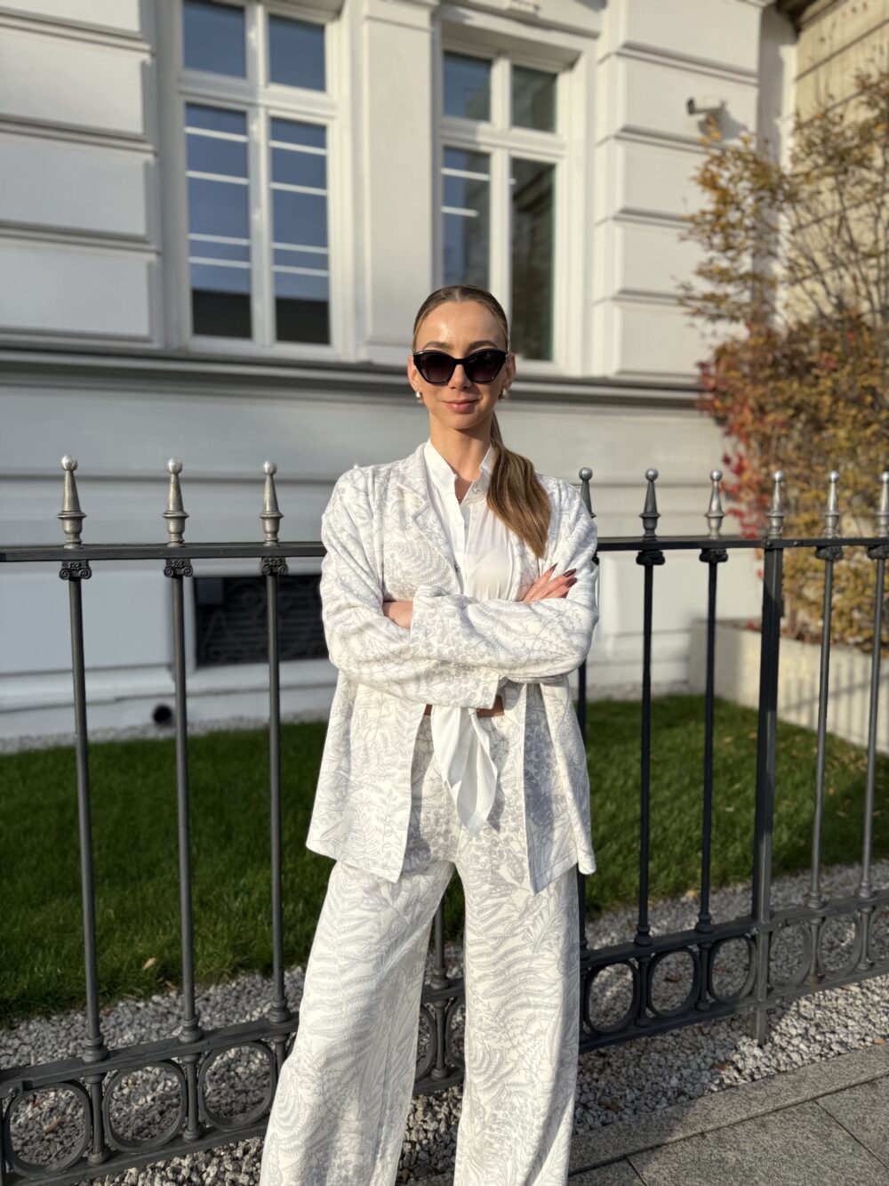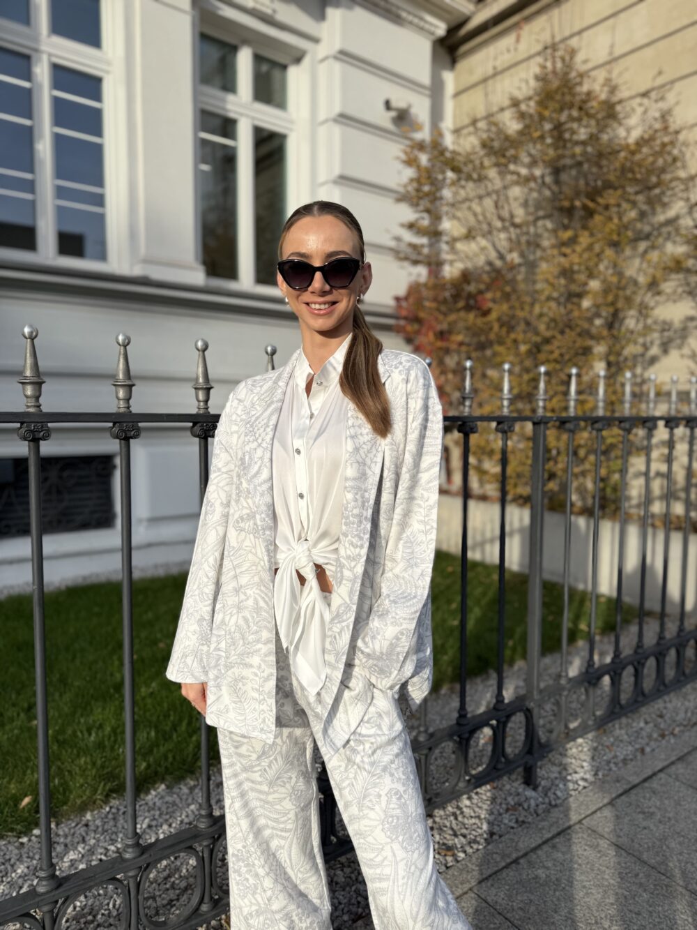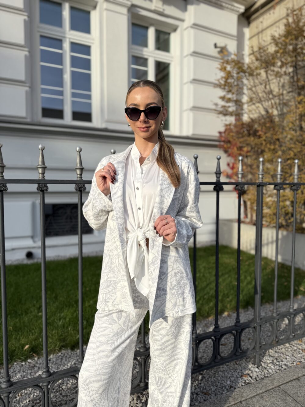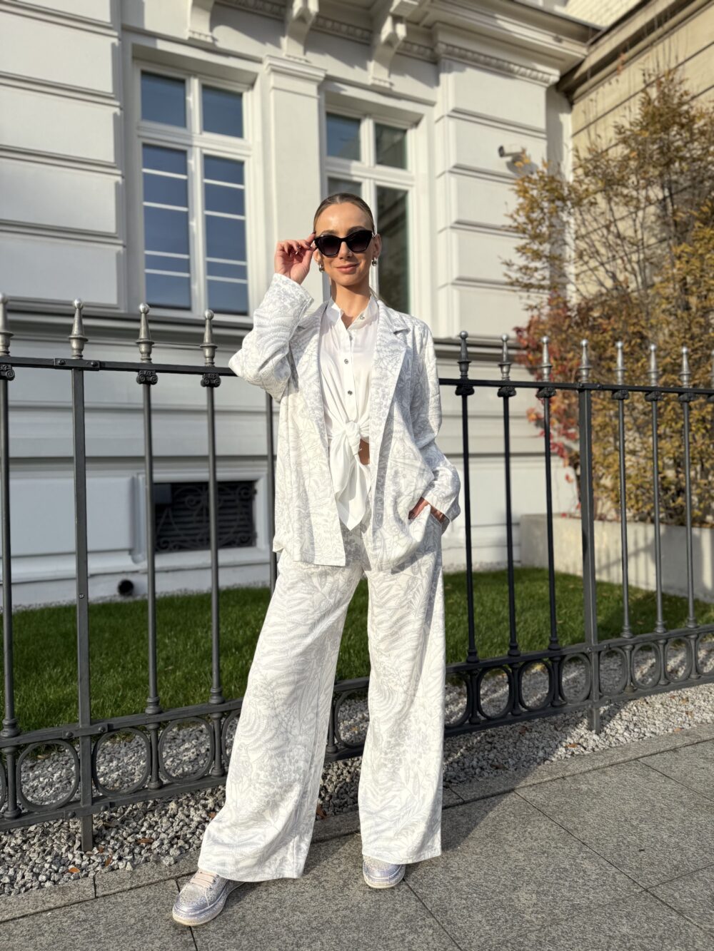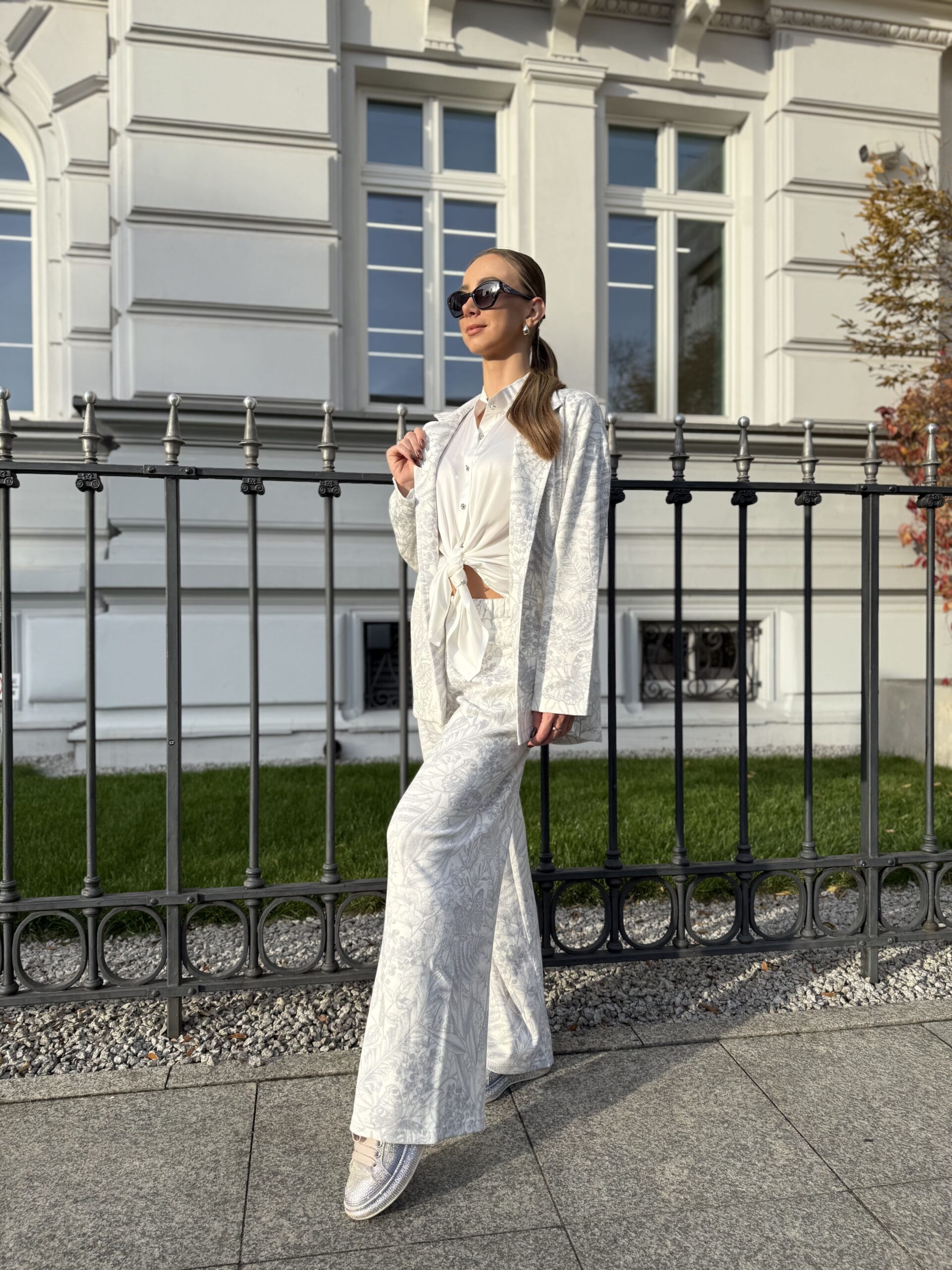 Pants made from a soft fabric with a subtle nap, featuring a loose fit and wide legs. Finished with an elastic waistband and pockets – comfortable, stylish, and perfect to pair with the blazer.