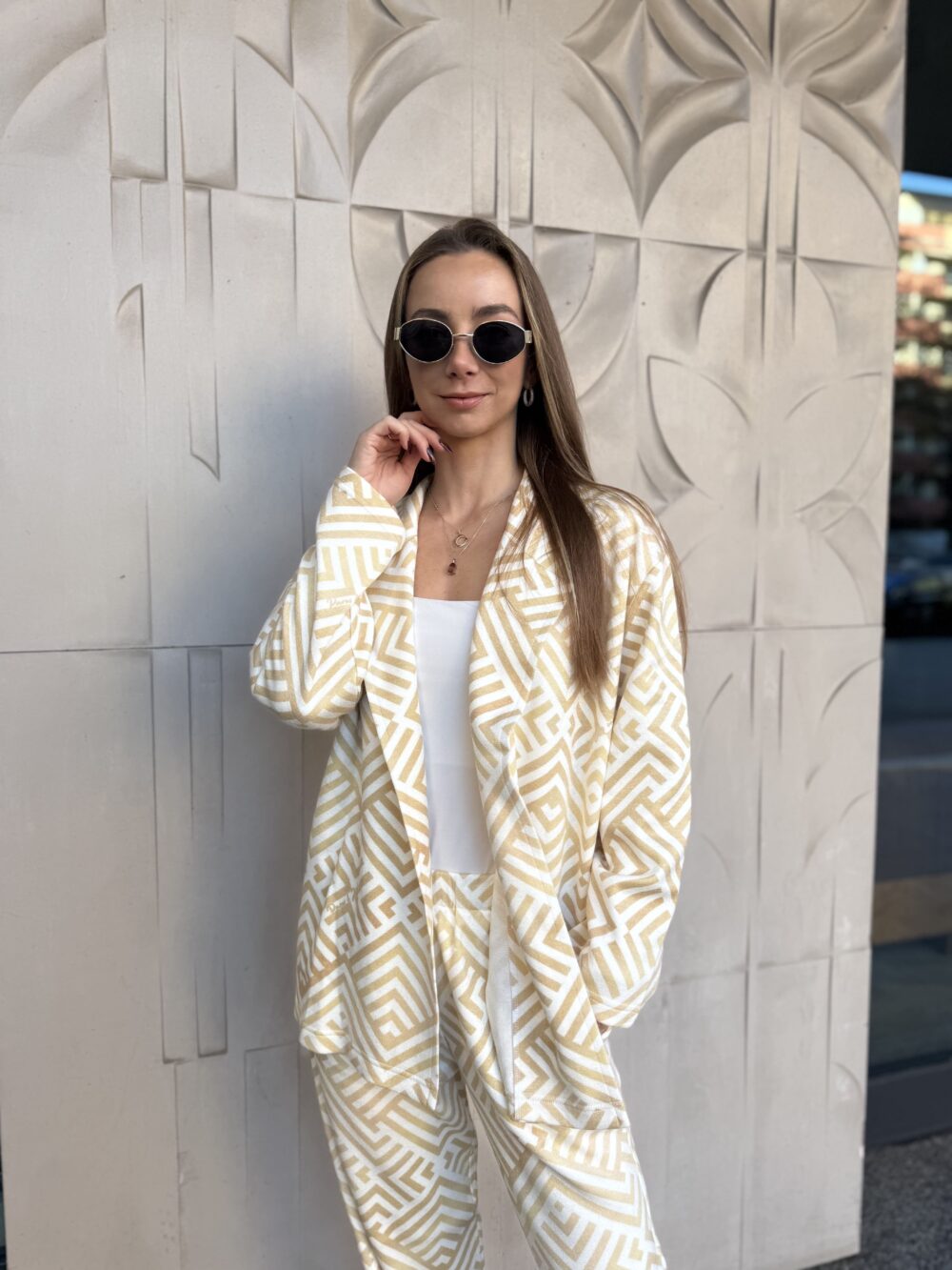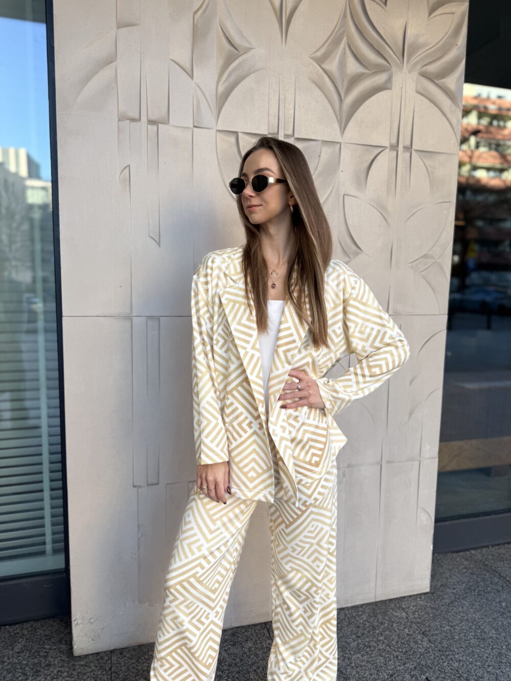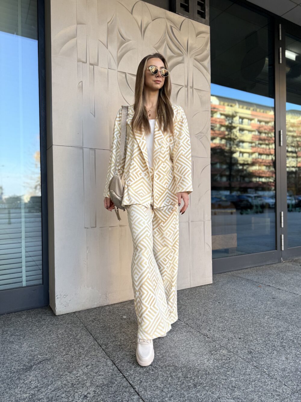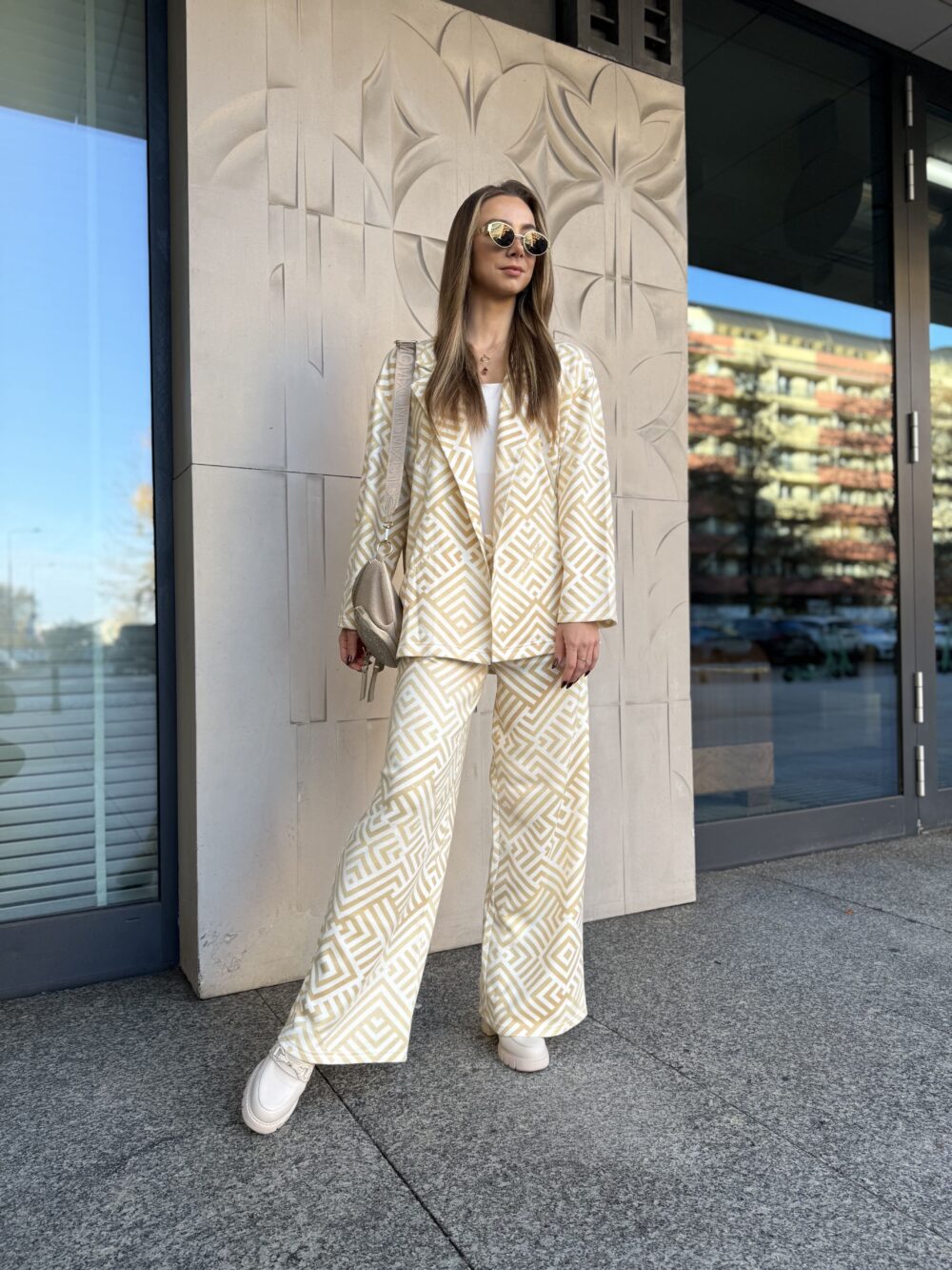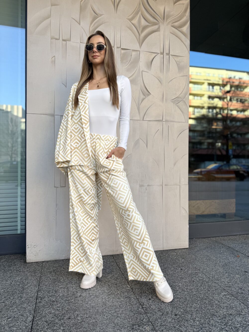 Spodnie z miękkiej tkaniny z subtelnym meszkiem, o luźnym kroju i szerokich nogawkach. Wykończone elastyczną gumką w pasie i kieszeniami – wygodne, stylowe i idealne do kompletu z marynarką.