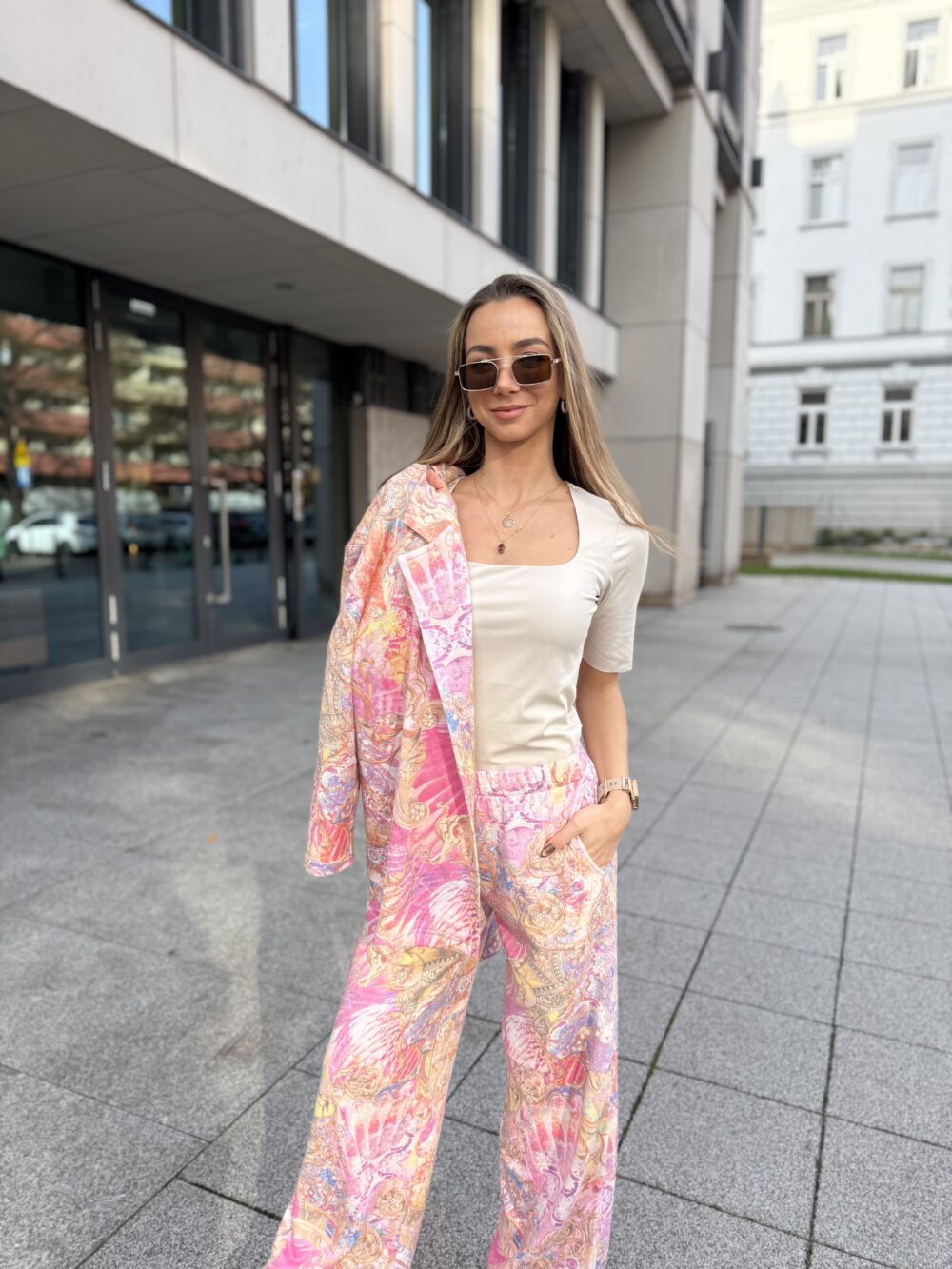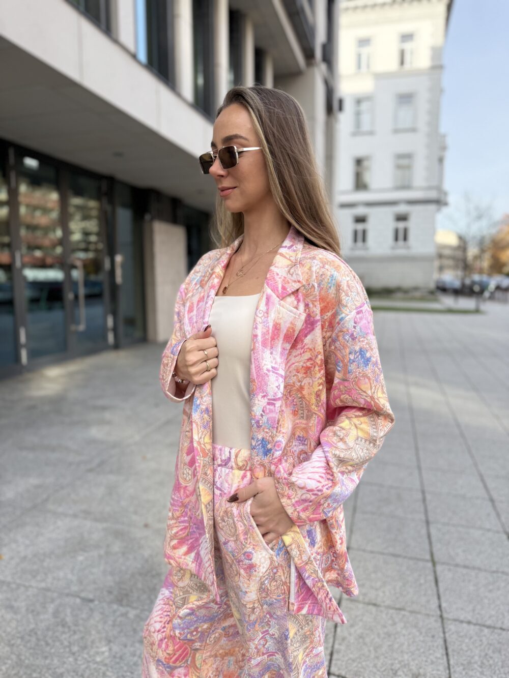 Spodnie z miękkiej tkaniny z subtelnym meszkiem, o luźnym kroju i szerokich nogawkach. Wykończone elastyczną gumką w pasie i kieszeniami – wygodne, stylowe i idealne do kompletu z marynarką.