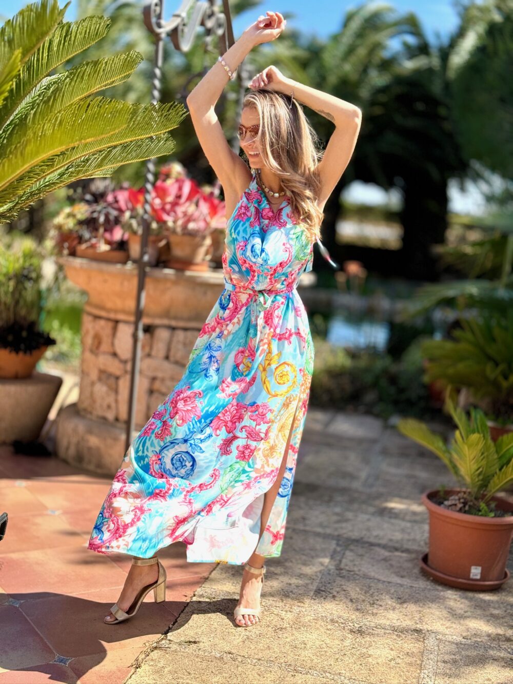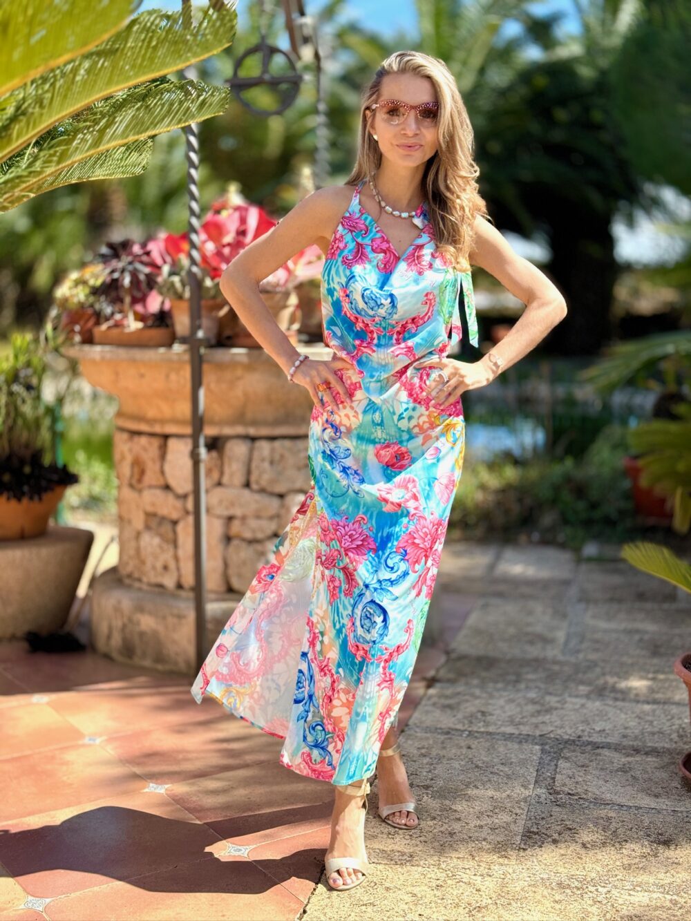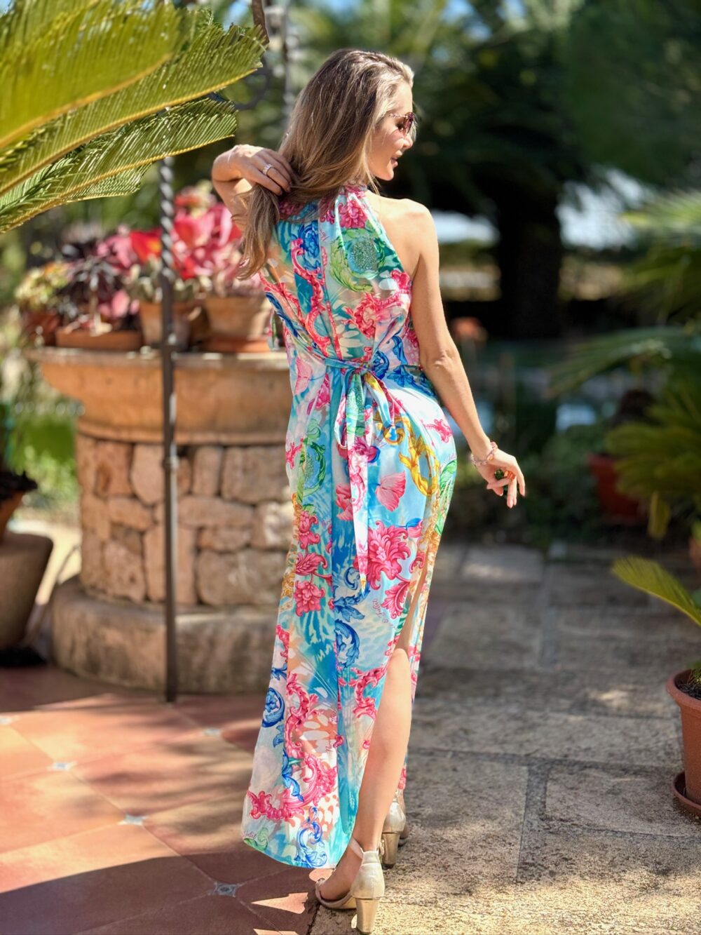 Długa sukienka z lejącym dekoltem (multiway: dekolt z przodu, lub z tyłu oraz rozcięciami po bokach)