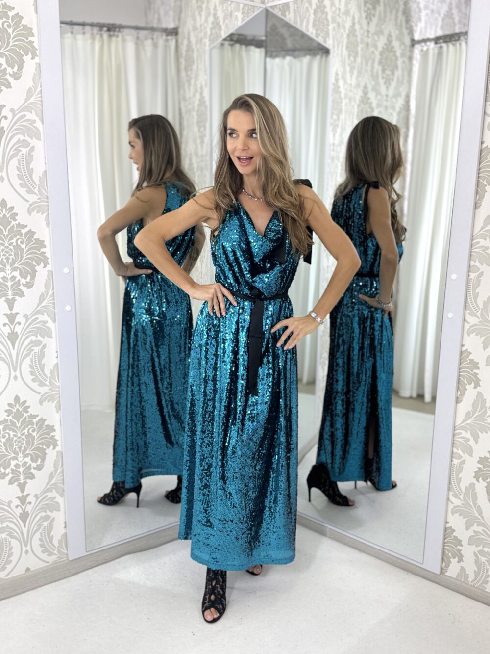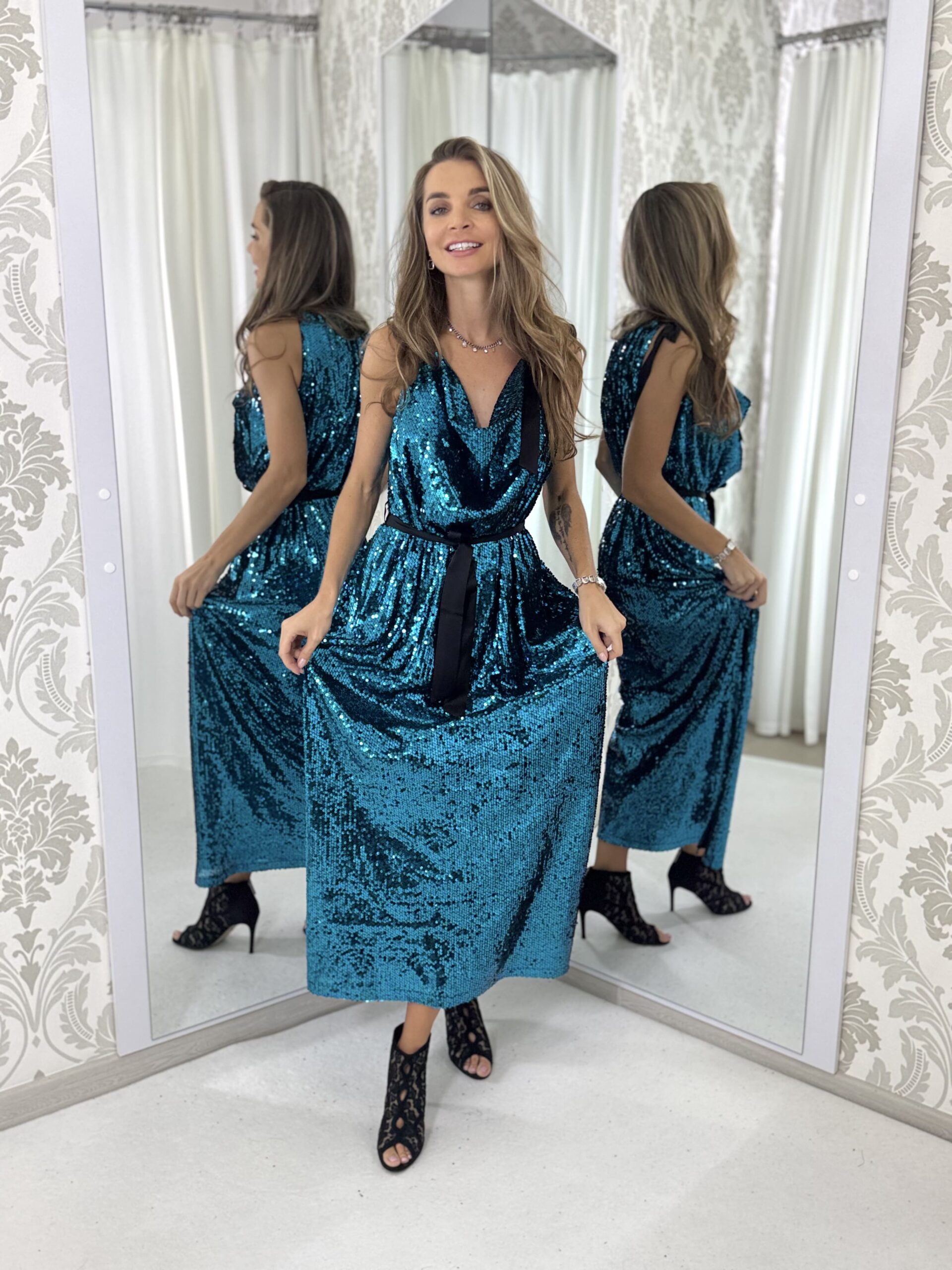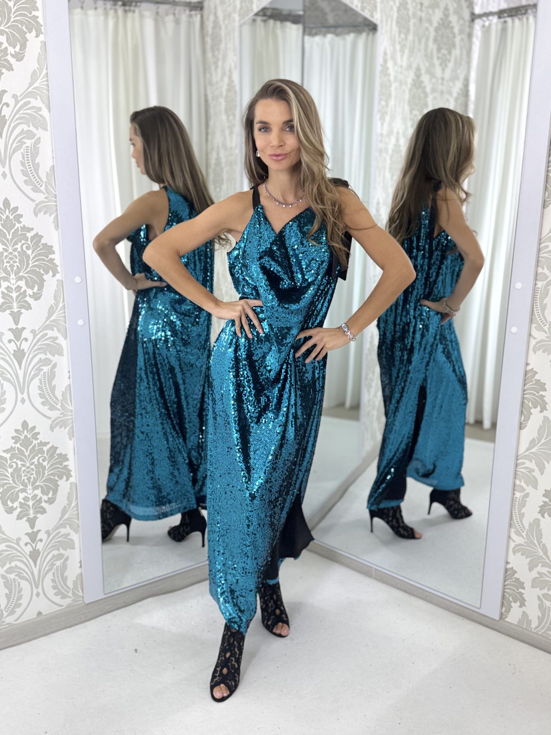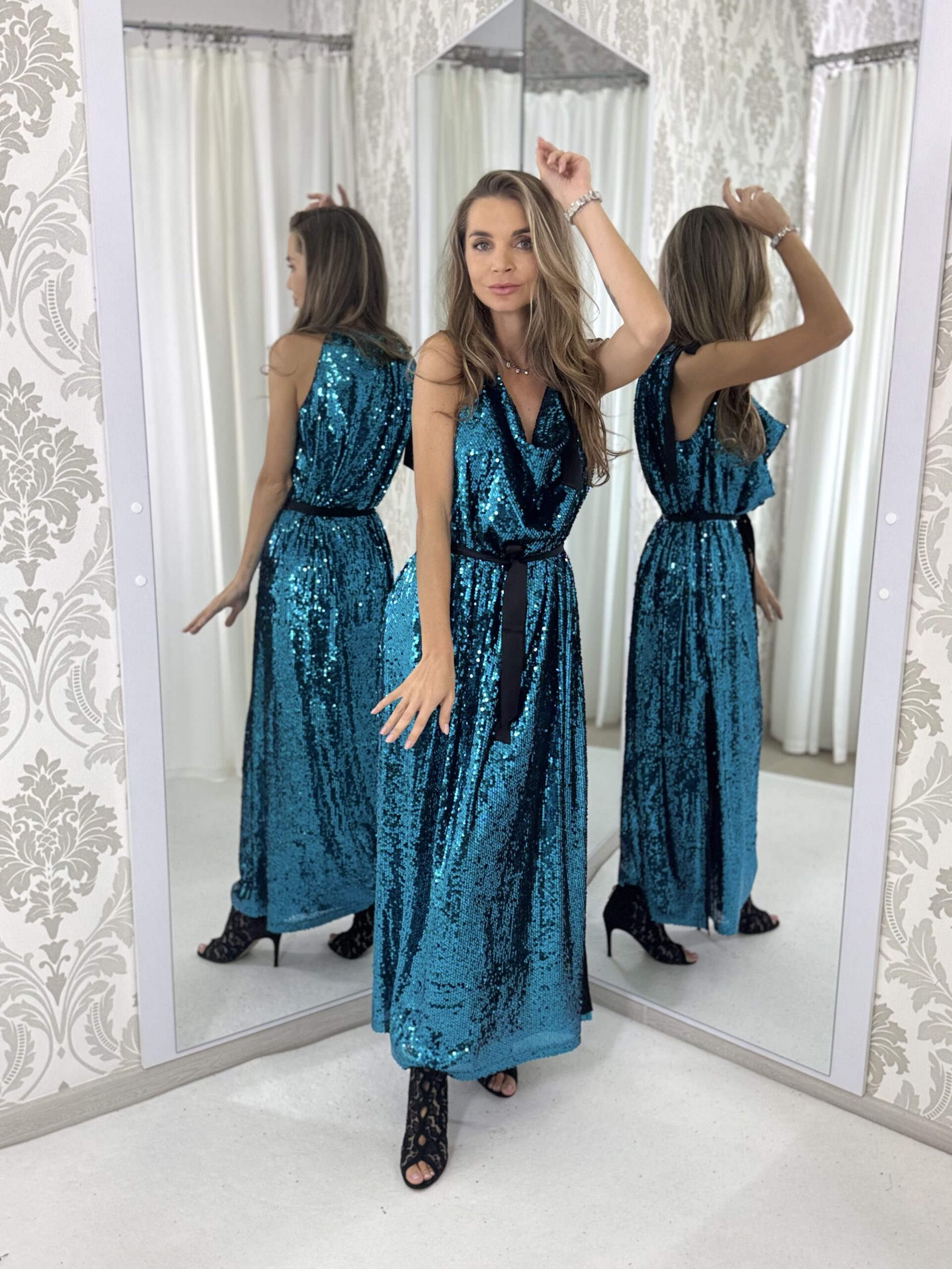 Długa sukienka z lejącym dekoltem (multiway: dekolt z przodu, lub z tyłu oraz rozcięciami po bokach) ozdobiona połyskującymi cekinami