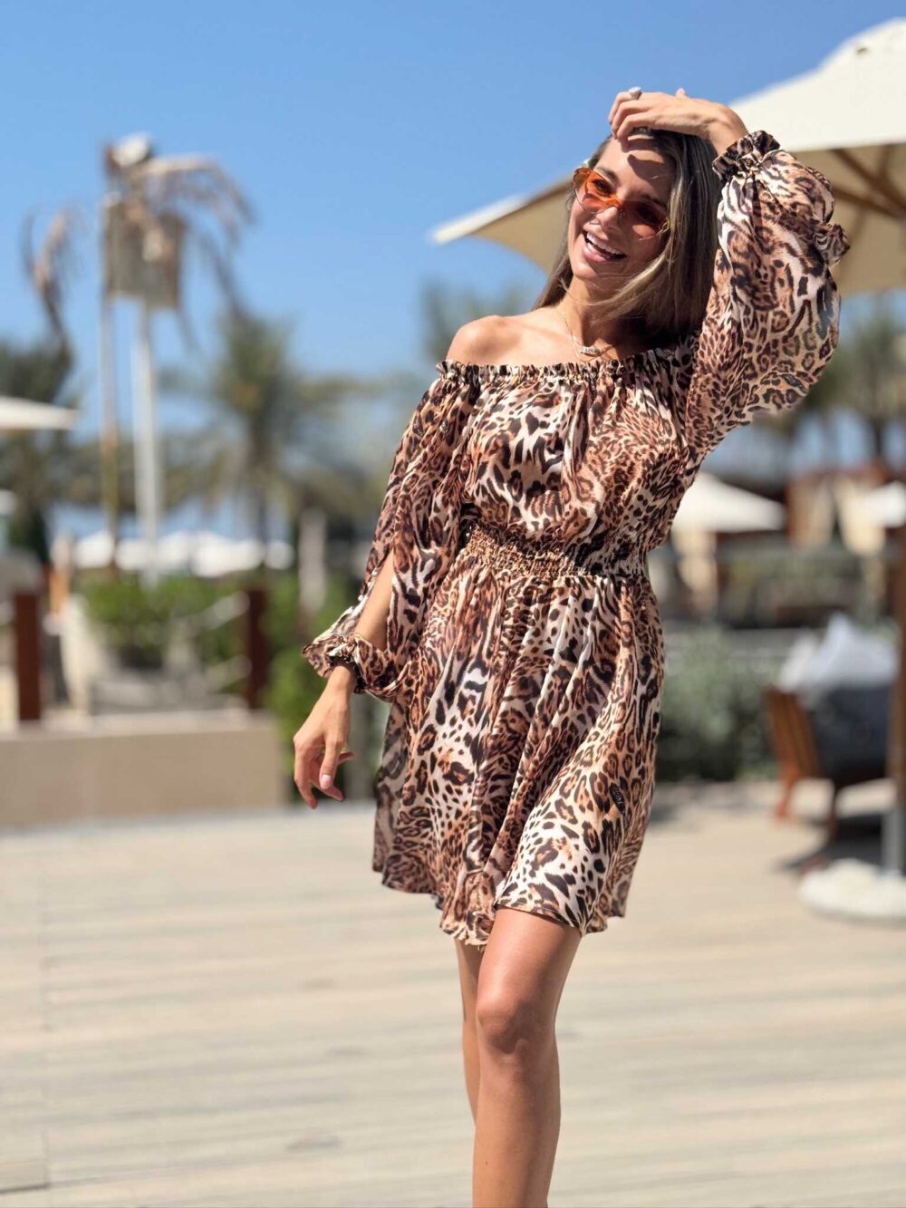 - Dekolt wykończony gumką: odsłonięte ramiona typu hiszpanka lub klasycznie zasłonięte